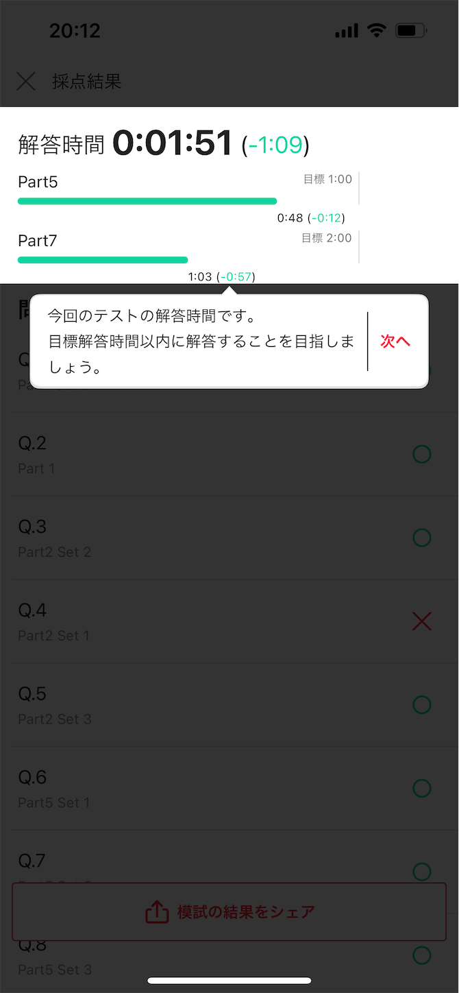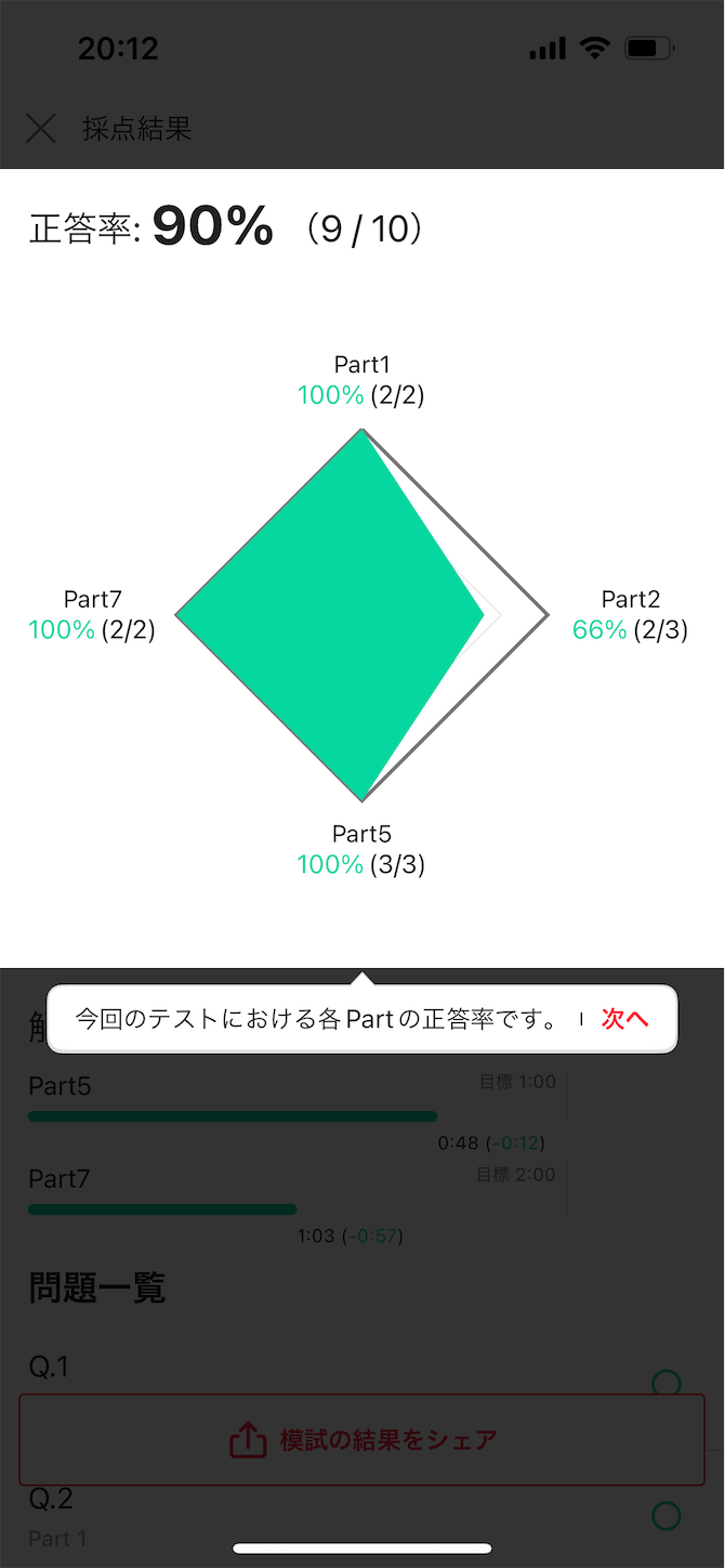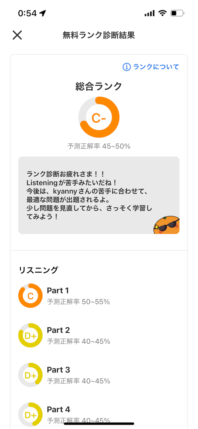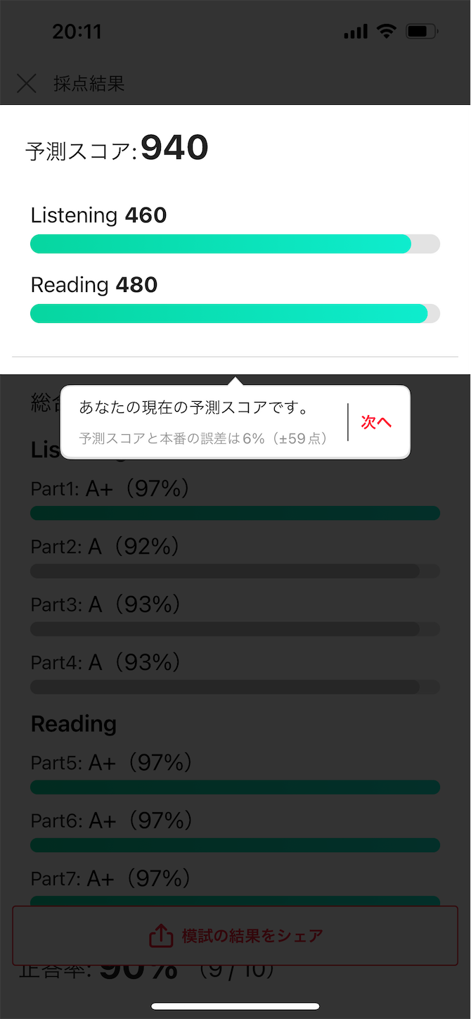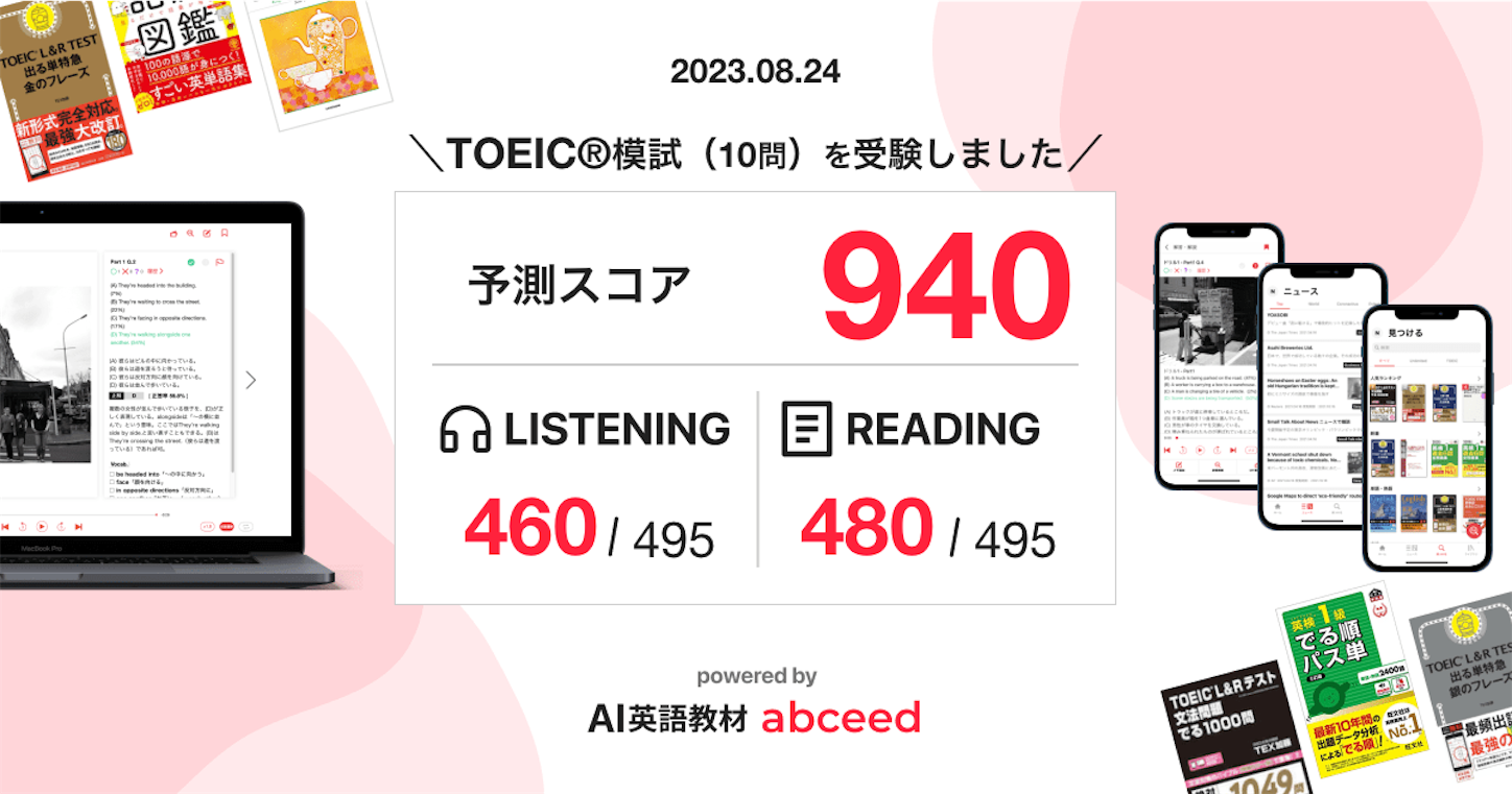 だいぶ前から気になってた abceed をようやく試してみた。一番短い 5 分で TOEIC スコア予測してみた。直近のスコアと近くて、それなりに精度は高そう。リスニング一問ややあてずっぽうで当たってしまったので、本来の予測スコアはさらに実際のスコアに近いかもしれない。リスニングが苦手なところも当たってる。