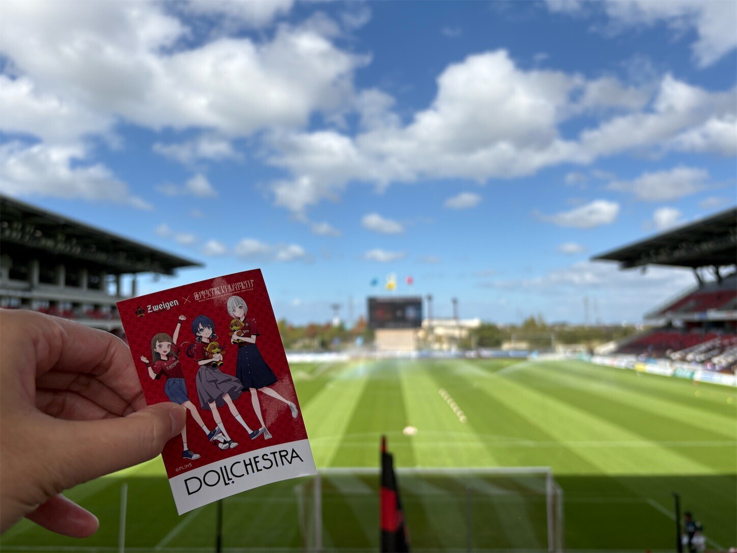 晴れていたが風が強く、寒い日だった。強風で浮き玉もかなり流されていた。スタジアム内常設グルメの倶利伽羅そばがありがたかった(にしんそばを食べた)。写真のステッカーは倶利伽羅そばで 500 円以上購入でもらったもの。ラブライブダービーでグッズ売り場は長蛇の列だったので、ステッカーもとっくに無くなっているかと思ったら意外にたくさん残っていた。